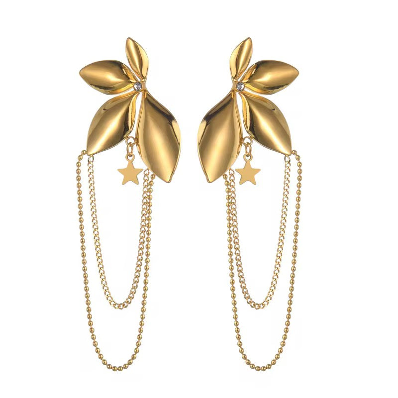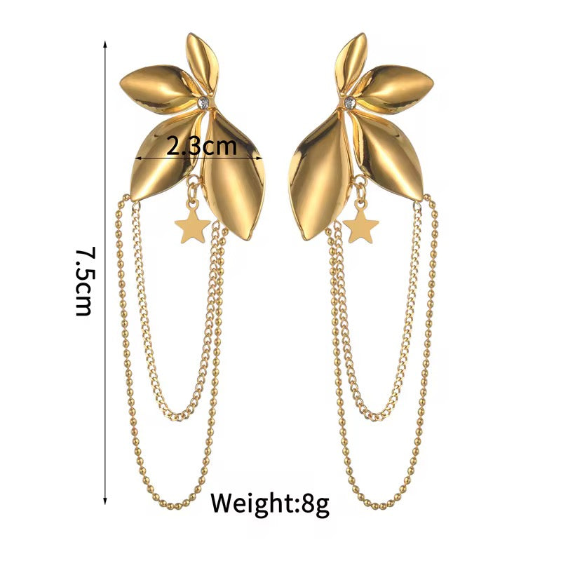 The Stellar Bloom Earrings blend floral elegance with a dreamy celestial touch. Sculpted in a soft, petal-like design, each earring features a polished 18K gold-plated bloom accented with a delicate cubic zirconia at the center. Two fine chain drapes add graceful movement, while a tiny dangling star charm completes the enchanting silhouette.
