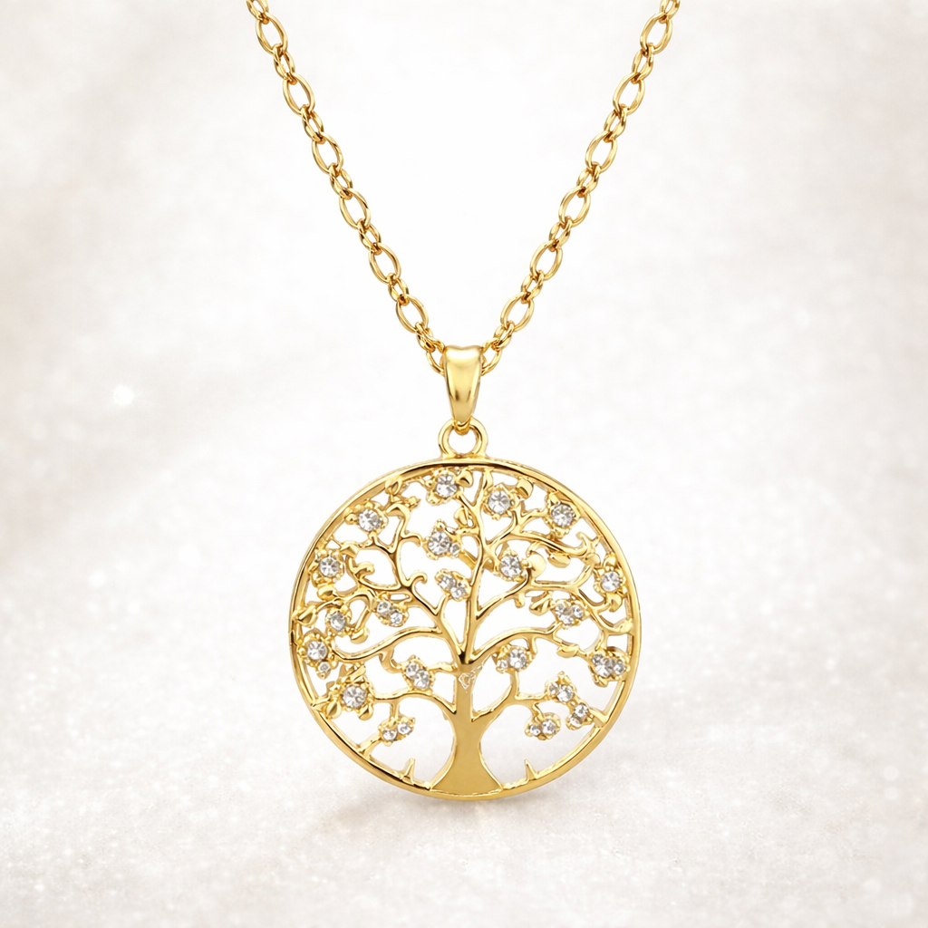 The Élysian Tree Necklace features a delicately crafted Tree of Life design, framed in radiant gold and adorned with fine zircon stones that shimmer with every movement.