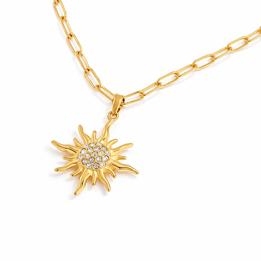 The Lumièra Pendant Necklace features a sculpted sunburst charm, delicately set with shimmering zircon stones at its center. Suspended from a sleek gold link chain, it captures light effortlessly and enhances the natural glow of the skin.