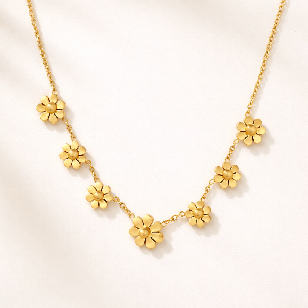 The Fiori D’Oro Necklace features delicate golden flower charms gracefully linked along a fine chain, creating a luminous statement around the neckline. Each polished petal reflects light beautifully, giving a subtle glow that elevates both everyday outfits and special occasions.