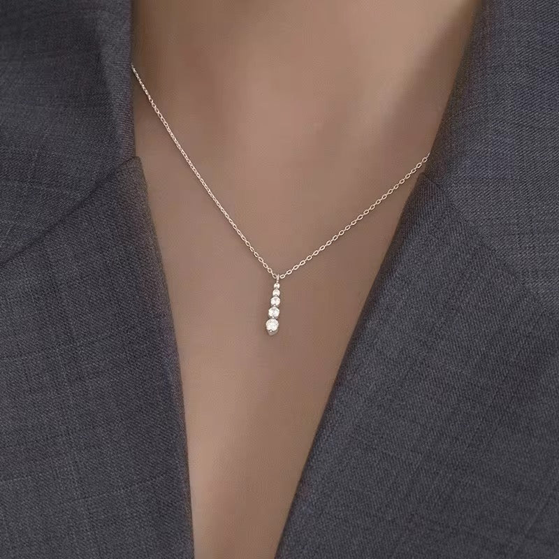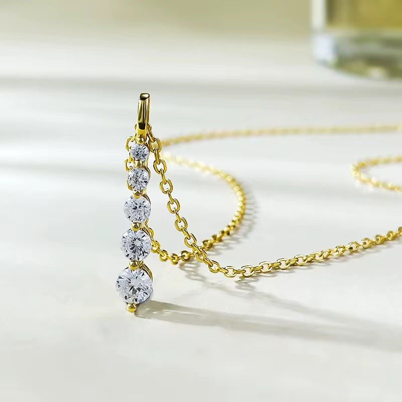 The Lumi Drop Necklace features a delicate row of brilliant round stones descending gracefully from a fine gold chain. Designed to elongate the neckline, this timeless piece captures light beautifully with every movement.