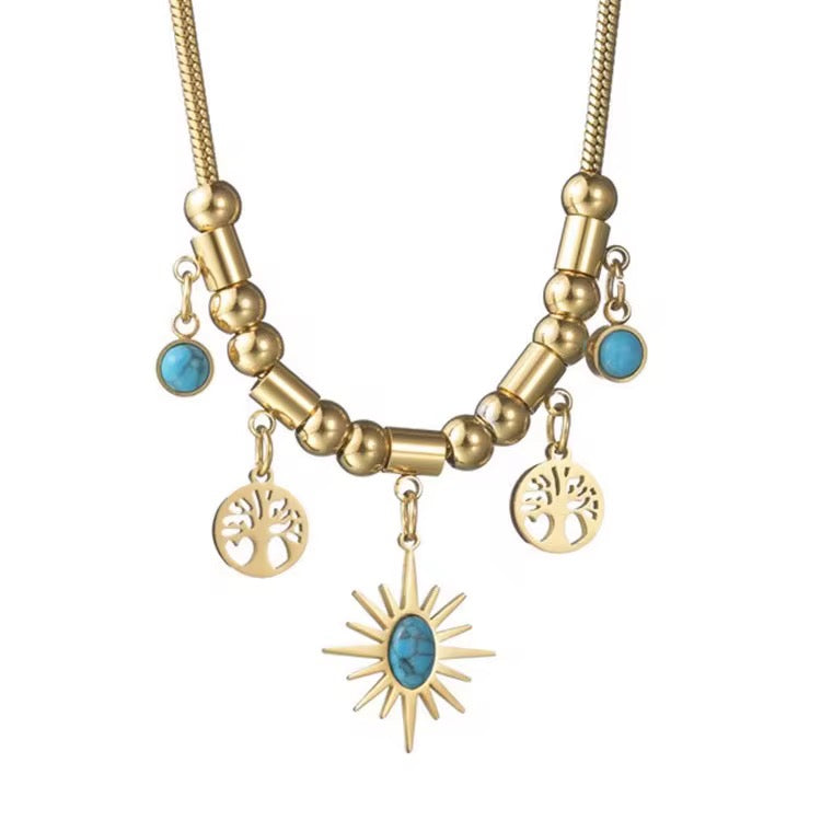 The Solara Essence Necklace blends celestial charm with natural symbolism, creating a piece full of warmth, meaning, and elegance. Crafted in 18K gold-plated stainless steel, it features a striking sunburst pendant centered with a turquoise-patterned stone—symbolizing protection, clarity, and inner peace.