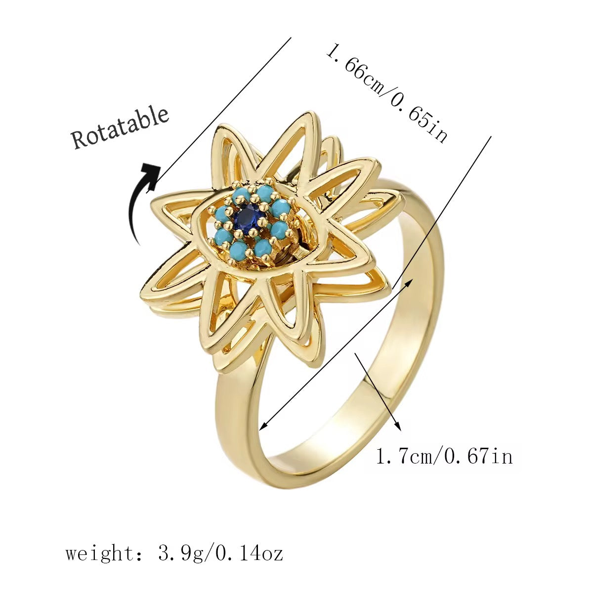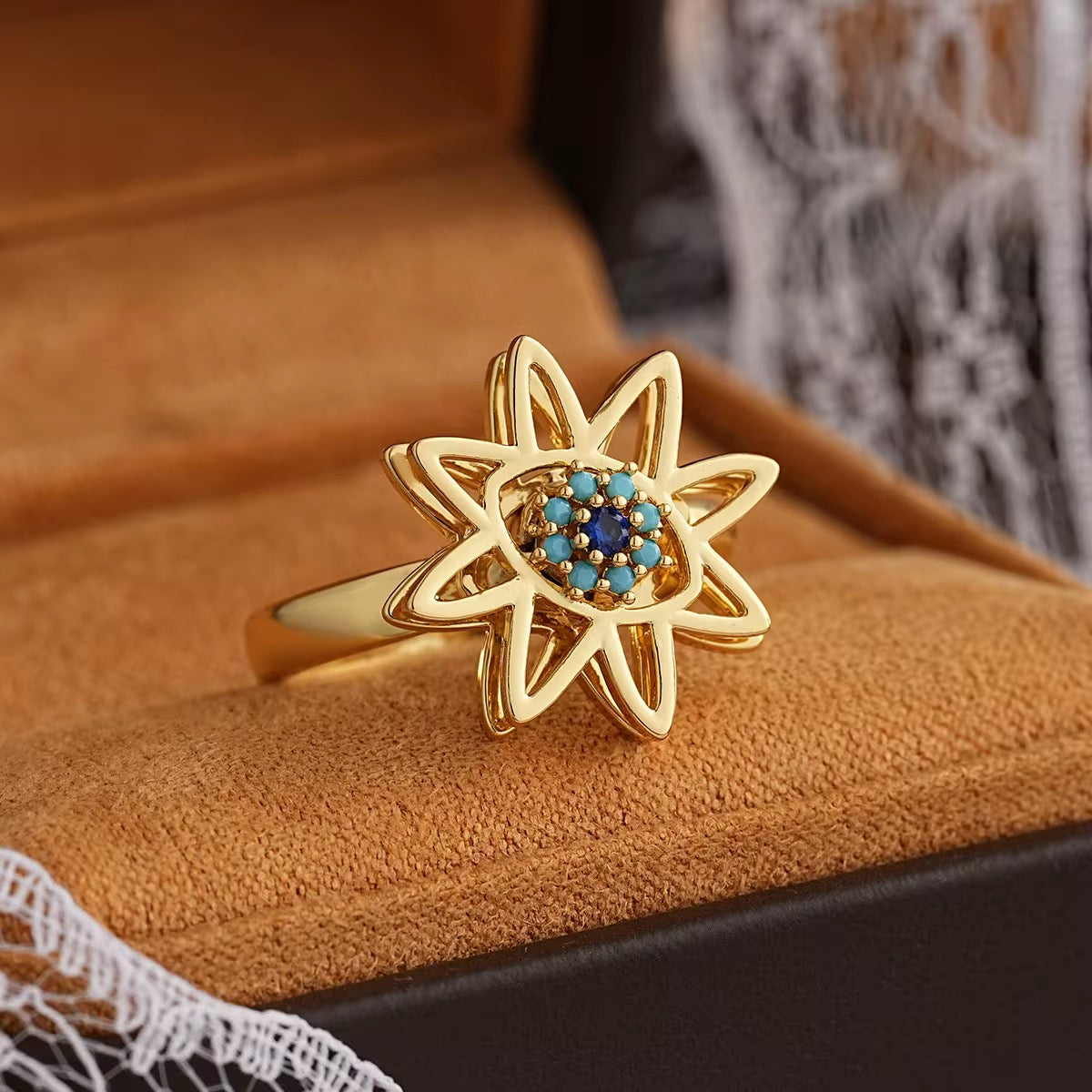 Shine with the Solara Bloom Rotating Ring, a radiant piece inspired by blooming petals and timeless protection. Its open sunburst design surrounds a turquoise-studded evil-eye center, creating a standout look that catches every light.