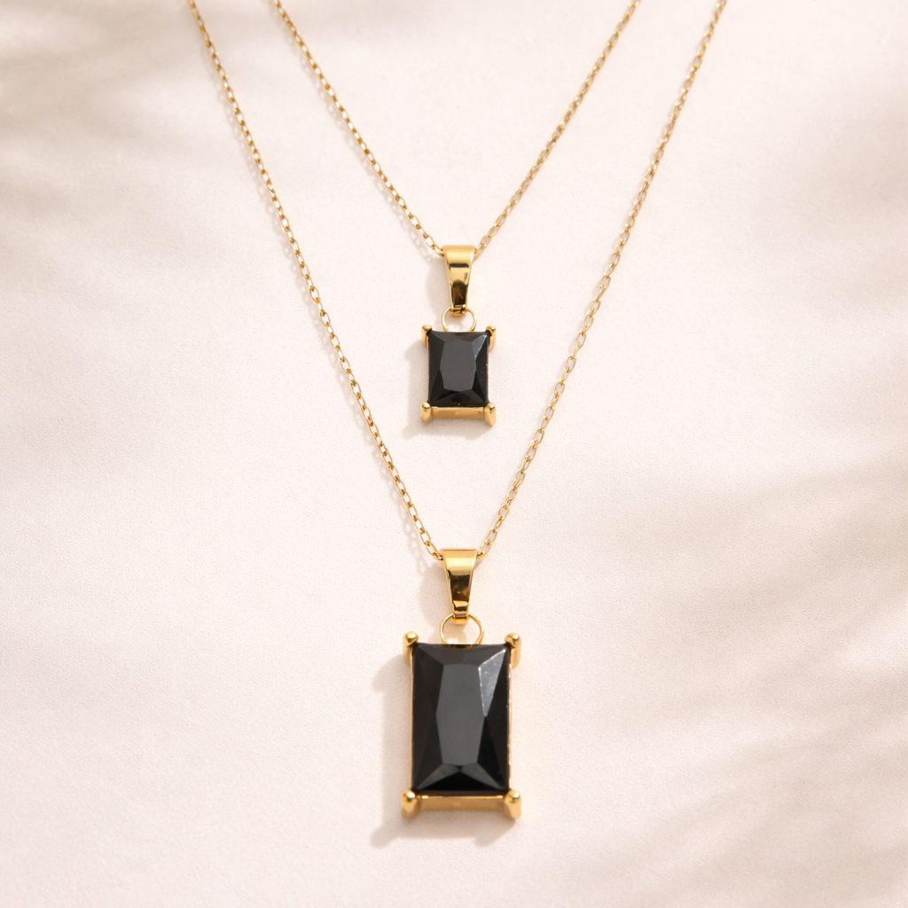 This Echo Stones Necklace features a double chain and two rectangular-shaped black stones for a unique and elegant look. The use of black stones adds a touch of sophistication and versatility to any outfit. Perfect for both casual and formal occasions, this necklace is a must-have for any jewelry collection.